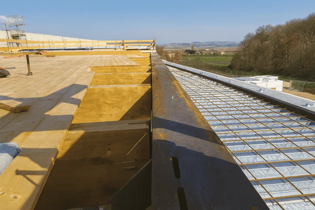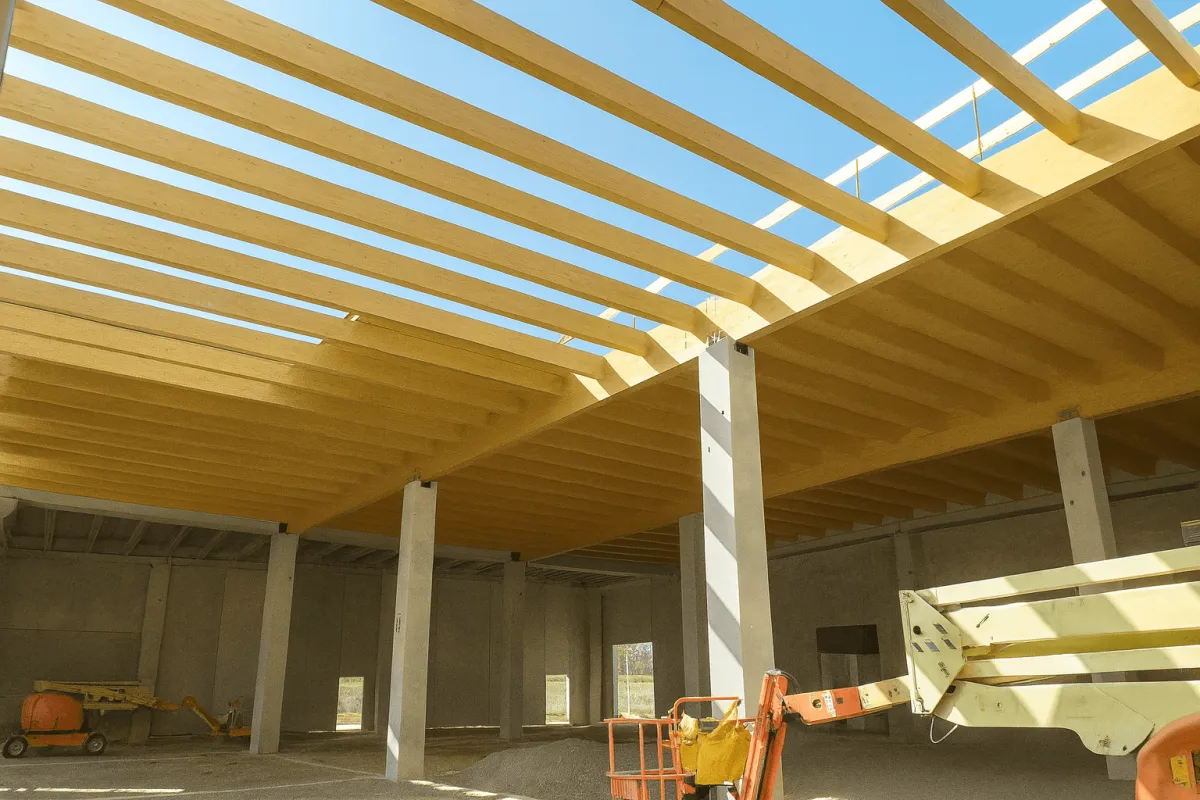 Copertura moderna in legno lamellare caratterizzata da archi portanti curvi e travature secondarie che garantiscono solidità, leggerezza e un’estetica naturale. Il rivestimento in WPC (wood-plastic-composite) garantisce una durabilità negli anni senza bisogno di alcuna manutenzione.
