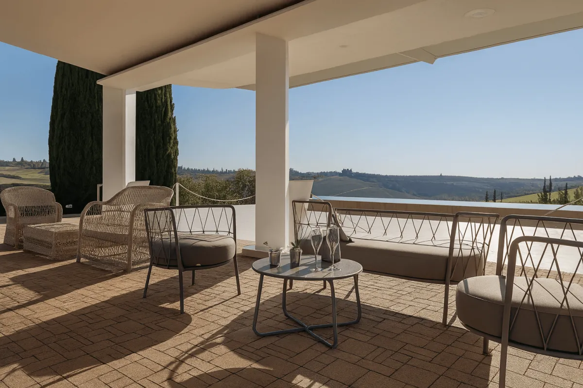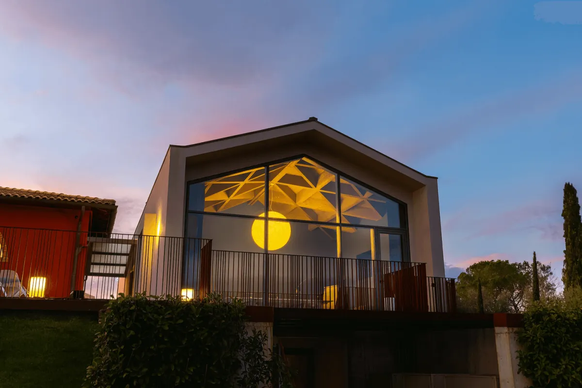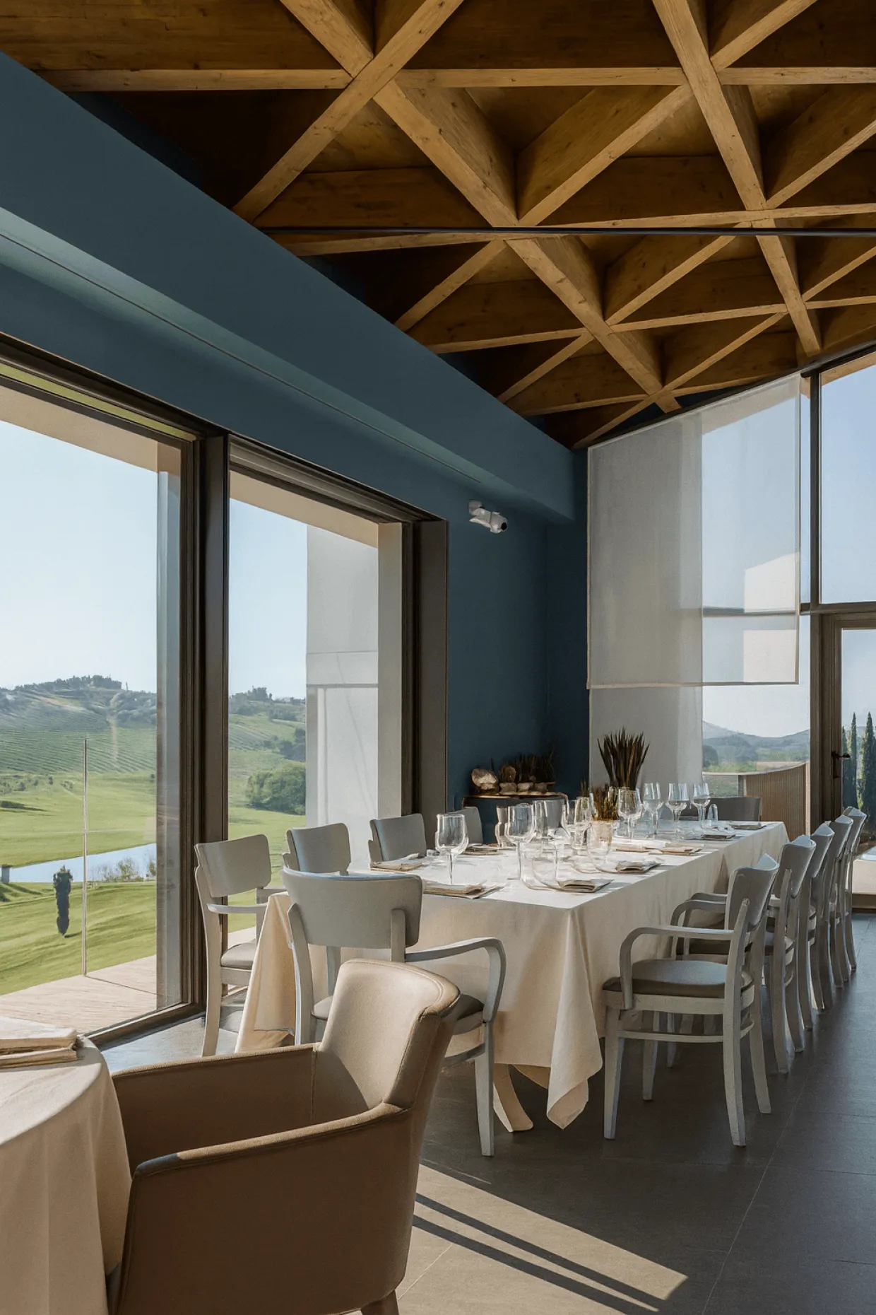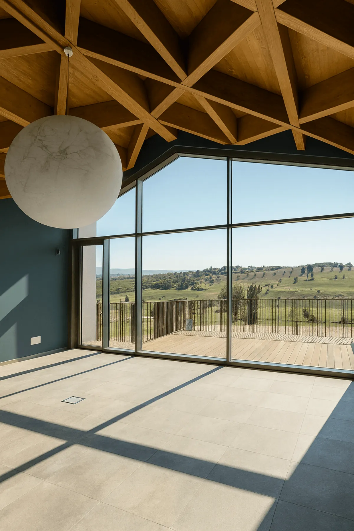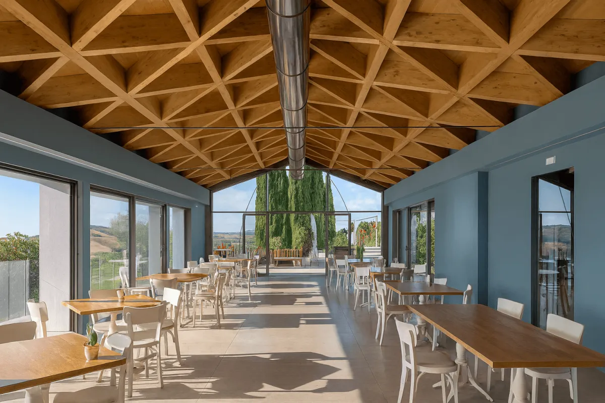 Qui, il legno non è un rivestimento, ma l’elemento architettonico principale. L’imponente orditura lignea a vista (travi reticolari e capriate complesse) non è solo un elemento portante che supporta grandi campate, ma il protagonista assoluto del design interno. L’effetto è un ambiente vasto e luminoso, con un’acustica ottimizzata, che beneficia della leggerezza e della resistenza al fuoco intrinseca delle strutture in legno.