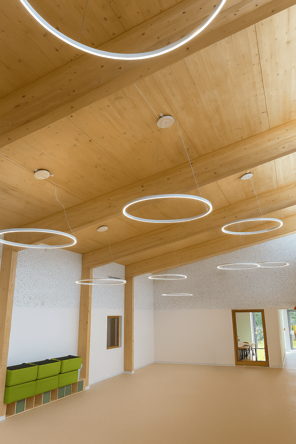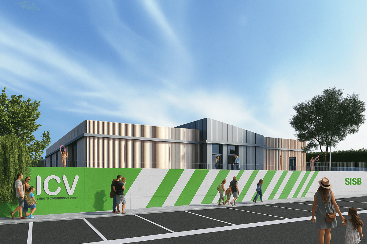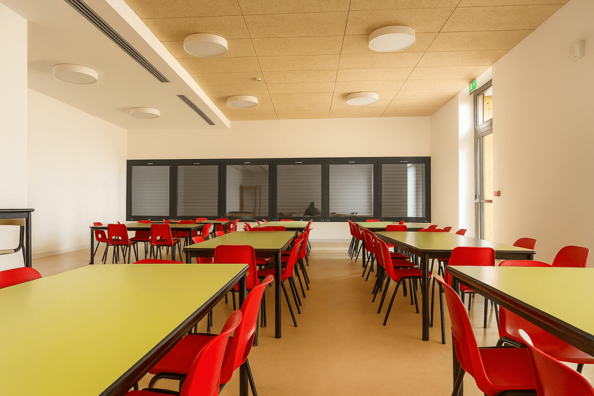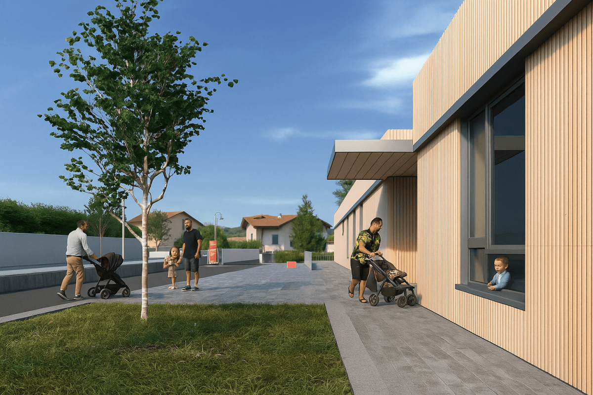 Un edificio che si sviluppa in lunghezza e su un piano, facilitando l’accesso e la sicurezza, mentre gli spazi verdi circostanti diventano parte integrante dell’esperienza scolastica.
