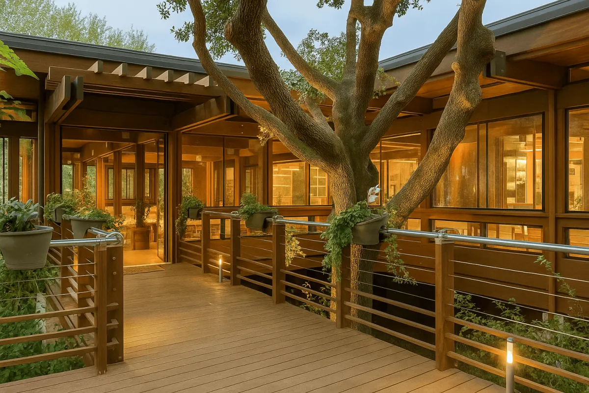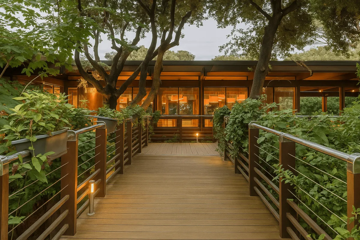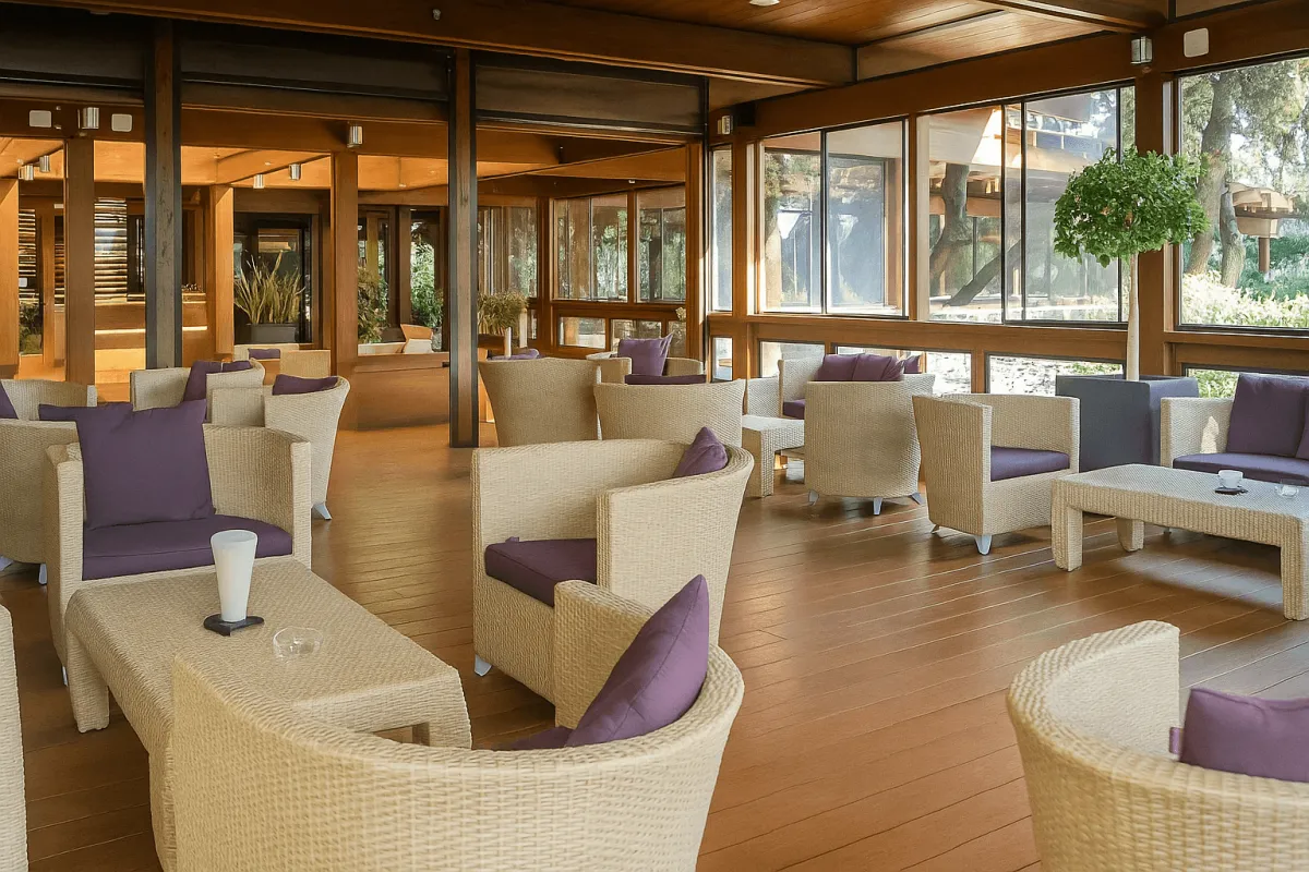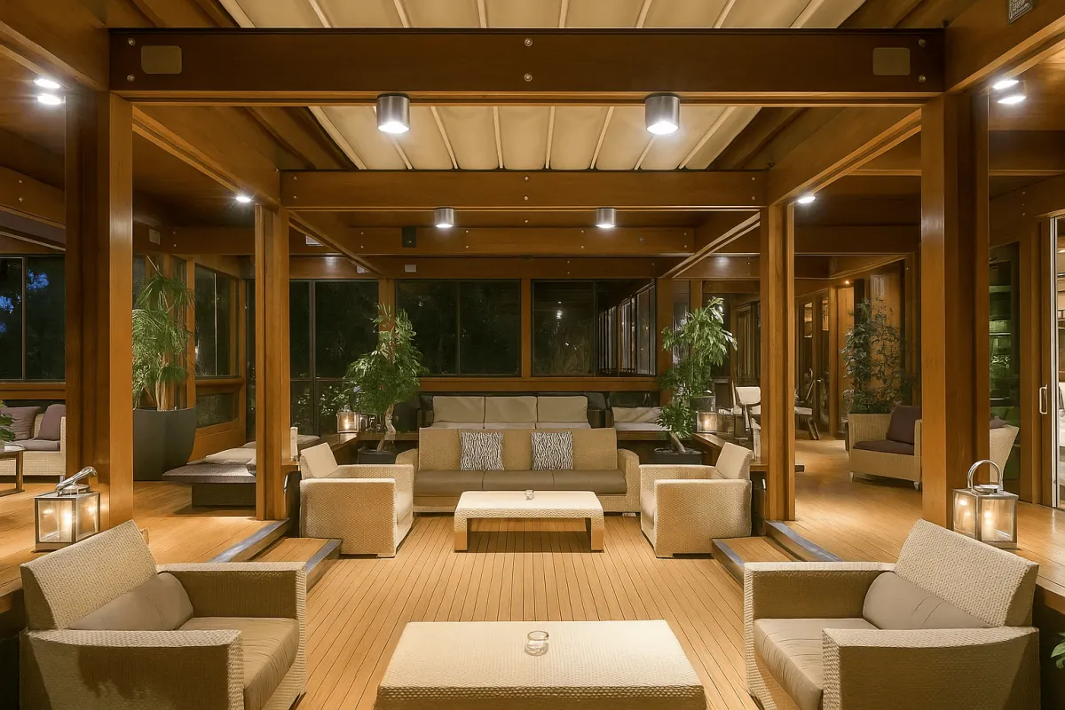Un’architettura concepita per l’assoluto relax. Le essenze lignee scure creano un involucro di lusso discreto, sostenuto da pilastri massivi che incorniciano il paesaggio. Il soffitto inonda lo spazio di luce naturale, mentre la struttura lamellare offre una percezione di calore impareggiabile